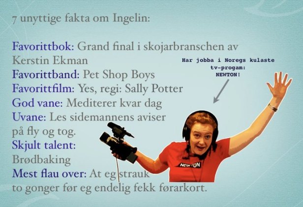 Eg er utdanna skodespelar frå Bergen Teaterskole og som fjernsynsjournalist og dokumentarfilmregissør frå Høgskulen i Volda. Har jobba i fleire aviser mellom andre bladet Tysnes (der også romanheltinna Engel Winge jobbar) og Hardanger Folkeblad. Har jobba fleire år i NRK, lengst i Newton. Frå 2007 har eg vore eit fritt menneske som lever av forfattarskapen min. Eg er fri til å leika, skriva, undervisa og skapa.